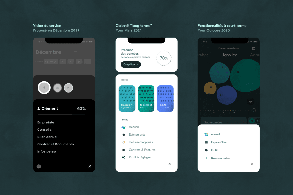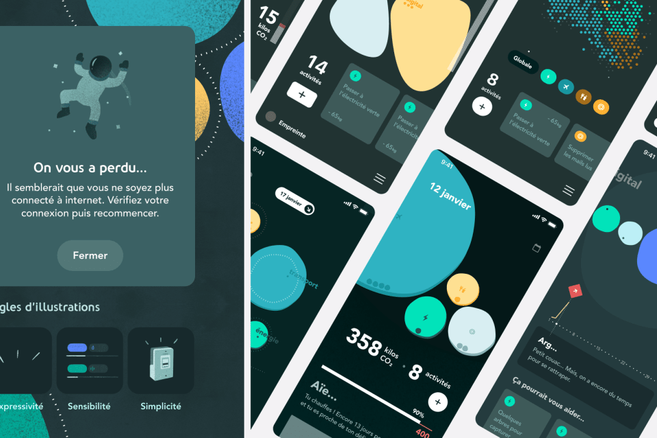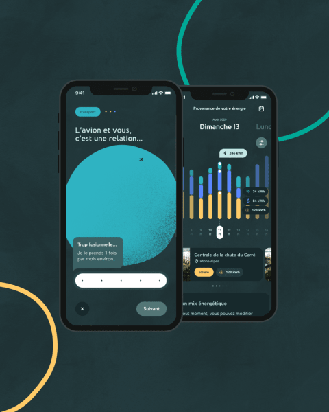 As a fast-growing green energy supplier, ekWateur wanted to develop an application to involve its customers in ecological transition, while increasing the number of customers in its portfolio. This aim went beyond the scope of a UX/UI service, as the entire experience of this eco-app had to be worked on, from its vision to its operation. Graphic design was also at the heart of the brief: How can you represent a “carbon footprint”? How can you keep a serious subject light?