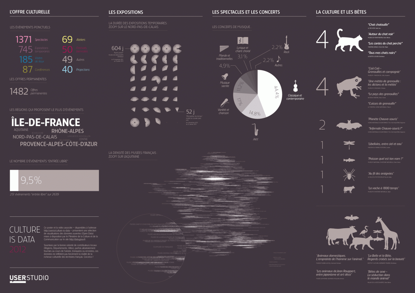 Culure is Data est un rapport qui présente l’ensemble des manifestations culturelles françaises sous un jour nouveau. Ici, les données sont issues d’Etalab, la branche du Ministère de la Culture qui s’occupe de la diffusion des données publiques de l’institution. En effet, la forme et l’image, lorsqu’elles s’articulent, permettent de donner plus de relief à l’information, d’en accroître l'intelligibilité.