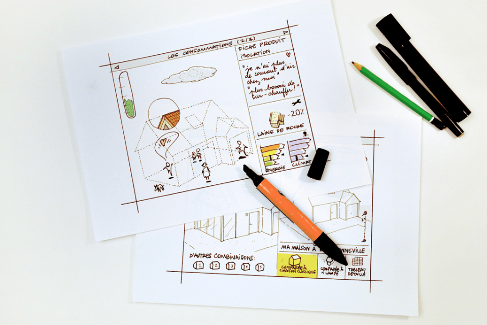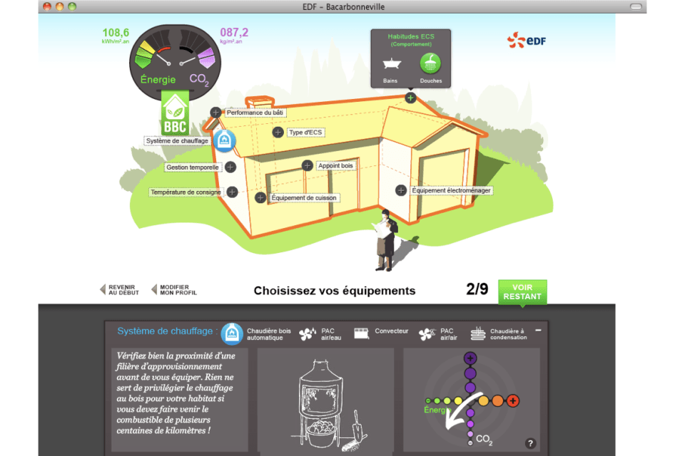 La conception écologique et responsable des bâtiments ou logements est aujourd’hui une préoccupation pour toute ouverture de nouveaux chantiers. Après le lancement du label BBC (Bâtiment Bas Carbone) sur la conception écologique et responsable des bâtiments, EDF R&D nous demanda de réfléchir à sa promotion auprès des particuliers afin d’en faciliter l’adoption. Il s’agissait pour nous de mettre au point un outil permettant à chacun de s’approprier ces enjeux globaux au coeur de ses projets de construction.