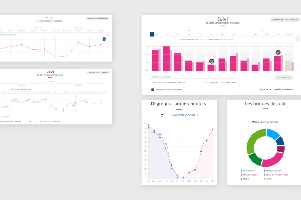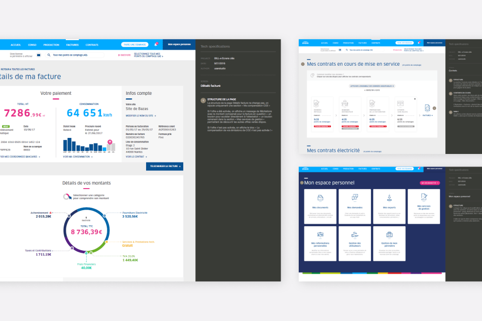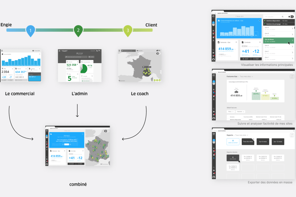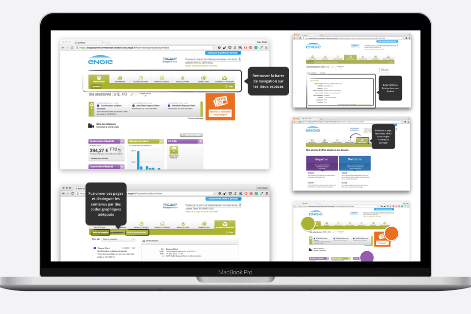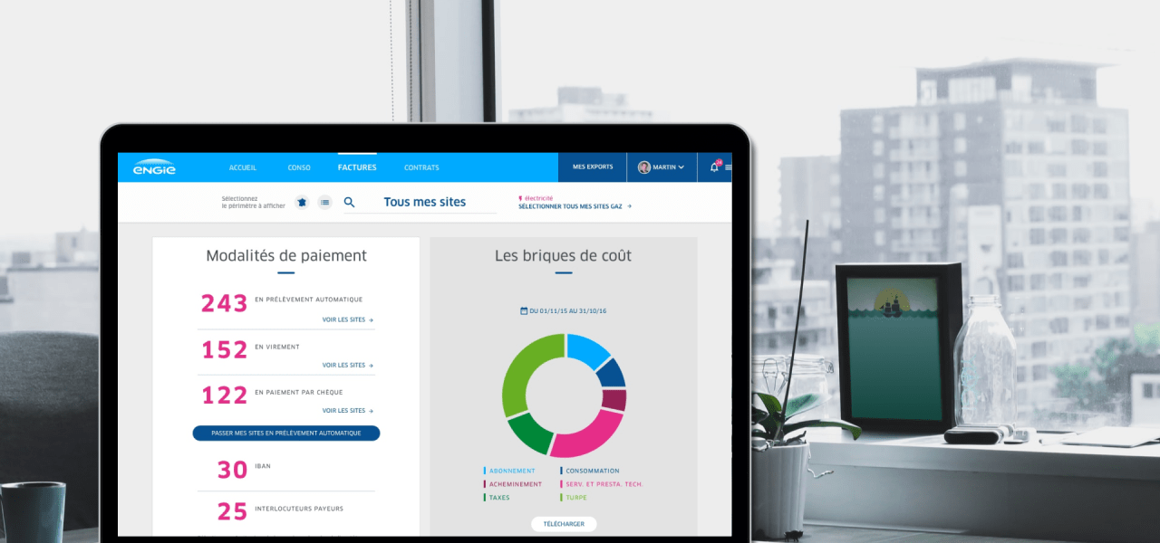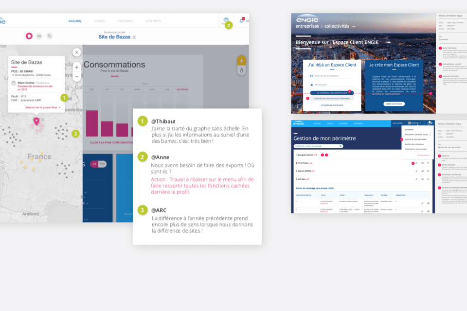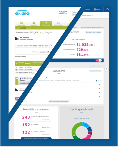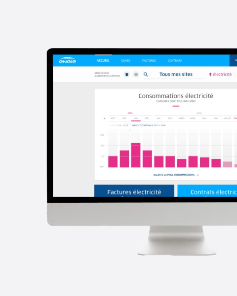 Début 2016, l'espace client d'ENGIE semble sous utilisé par les Entreprises et Collectivités. En particulier les clients multi-site de ce segment pourtant stratégique qui n'exploitent pas ou peu les fonctionnalités mises à leur disposition. Pendant 4 ans, nous avons accompagné ENGIE, étape par étape pour évaluer les services existants, mieux comprendre les usages de leurs utilisateurs, construire une vision partagée d'un nouvel espace totalement repensé, le concevoir dans les plus fins détails et enfin cadrer la création de nouvelles fonctionnalités.
