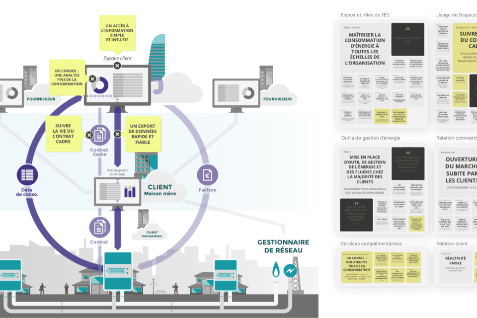 Le service après-vente est débordé pour soutenir les grands comptes dans la gestion de leurs contrats. ENGIE se lance dans la création de Bill-e, l'espace 100% dédié aux clients pro. Le travail de conception impose de ré-interroger les process de relation client, d'aligner des différents métiers et surtout de couvrir les besoins d’une cible pro multisites dont les besoins en pilotage et optimisation particulièrement forts.