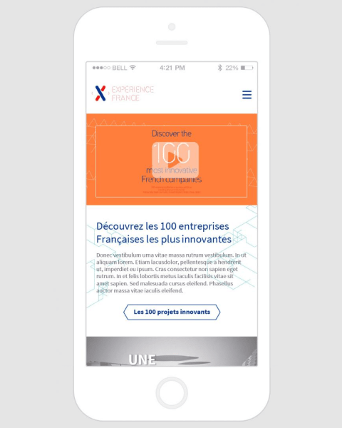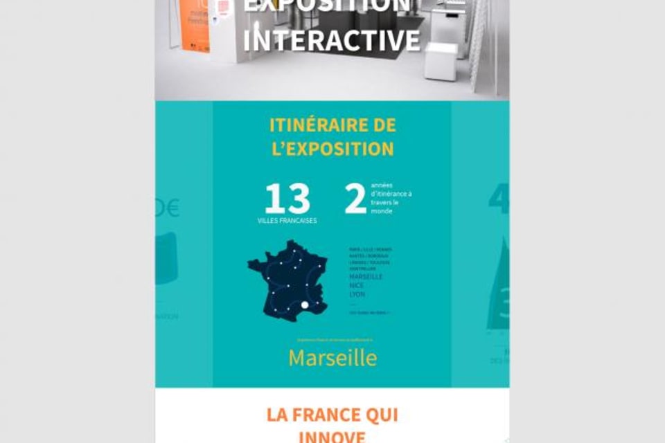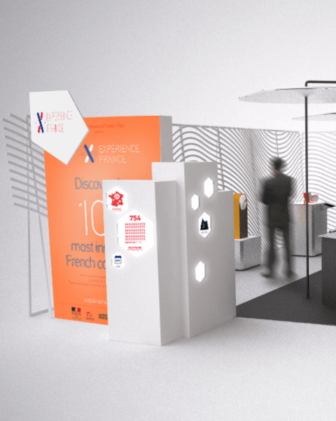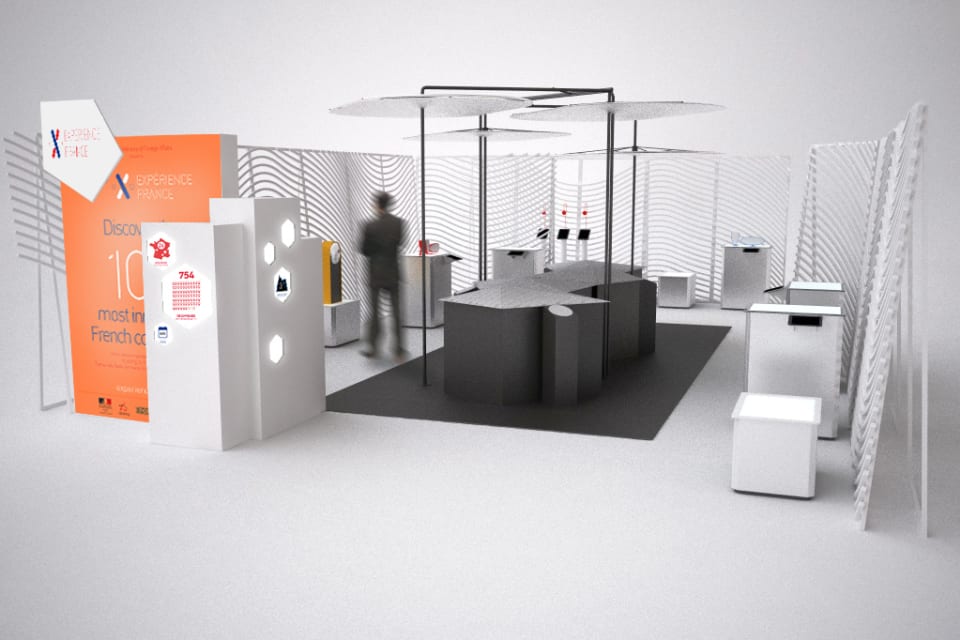 Projet de design d'espace et des interfaces associées à cet espace, Expérience France est une exposition permettant au public de découvrir les 100 entreprises les plus innovantes de France.