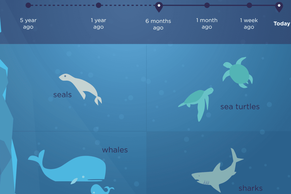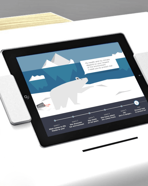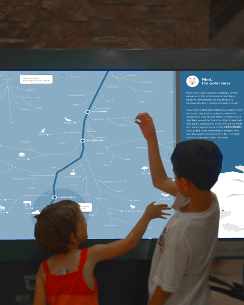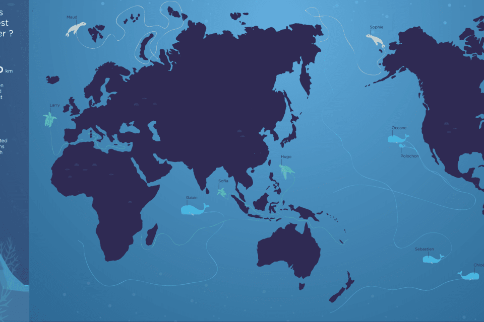 Nous avons notamment pensé et développé une interface à destination des petits et des grands pour visualiser en très grand les trajectoires des animaux marins et ainsi pouvoir comparer leur capacité à parcourir des kilomètres… Qui est le plus grand voyageur ? Une approche ludique pour captiver les enfants et apprendre combien les animaux parcourent de kilomètres pour manger et se reproduire. Nous avons aussi reconstitué un arbre phylogénétique des espèces et l'avons rendu interactif…