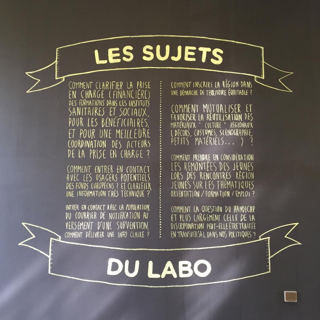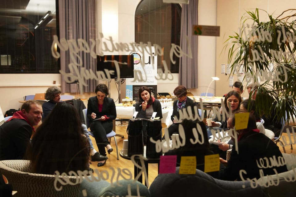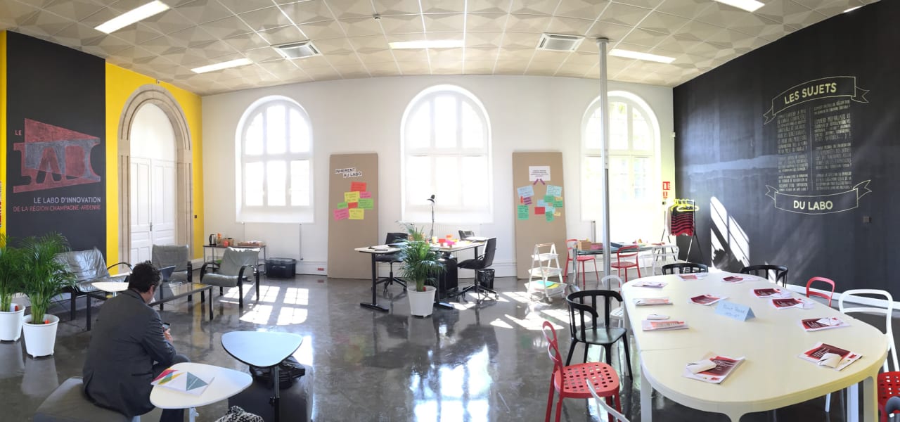 C'est en 2011 que la 27ème Région, client historique de l'agence, nous contacte pour nous confier une mission bien singulière pour des designers : imaginer le labo d'innovation de la Région Champagne-Ardenne, une tâche jamais entreprise en France. Intrigués et motivés par nos expériences passées dans l'innovation territoriale, notamment à Orléans avec la Lyonnaise des Eaux, nous sautons le pas. Dix semaines de travail in-situ, des centaines d'heures d'ateliers créatifs, d'analyse du territoire, de sensiblisation aux démarches de design et de dessin de logos plus tard, le labo est né.