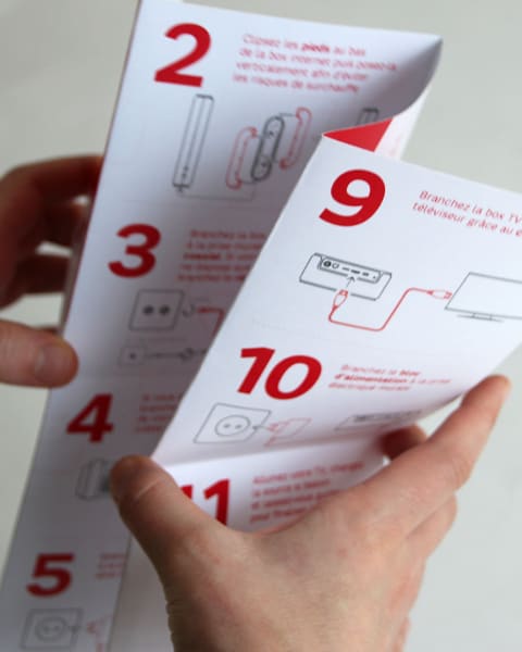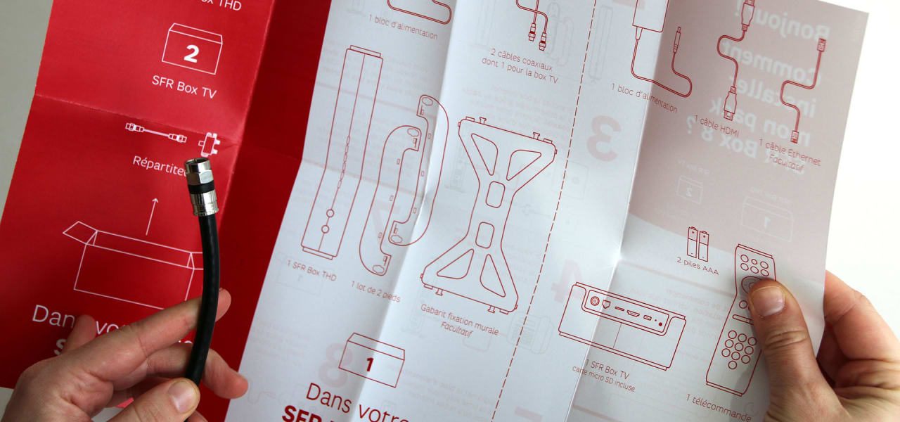 Tout un chacun a déjà vécu l’installation d’une nouvelle box : il y a une multitude de boites, des kilomètres de câbles, des étapes à suivre aussi précises qu’une opération à coeur ouvert, bref c’est une expérience loin d’être désirable. Ce constat a frappé SFR lors du lancement de sa nouvelle box TV dotée d’une notice certes jolie mais assez peu fonctionnelle...Après avoir vu son SAV se faire inonder d’appels, le client nous a invité à repenser ce manuel afin qu’il endosse son véritable rôle : faciliter l’installation, avant d’être un support de marque.
