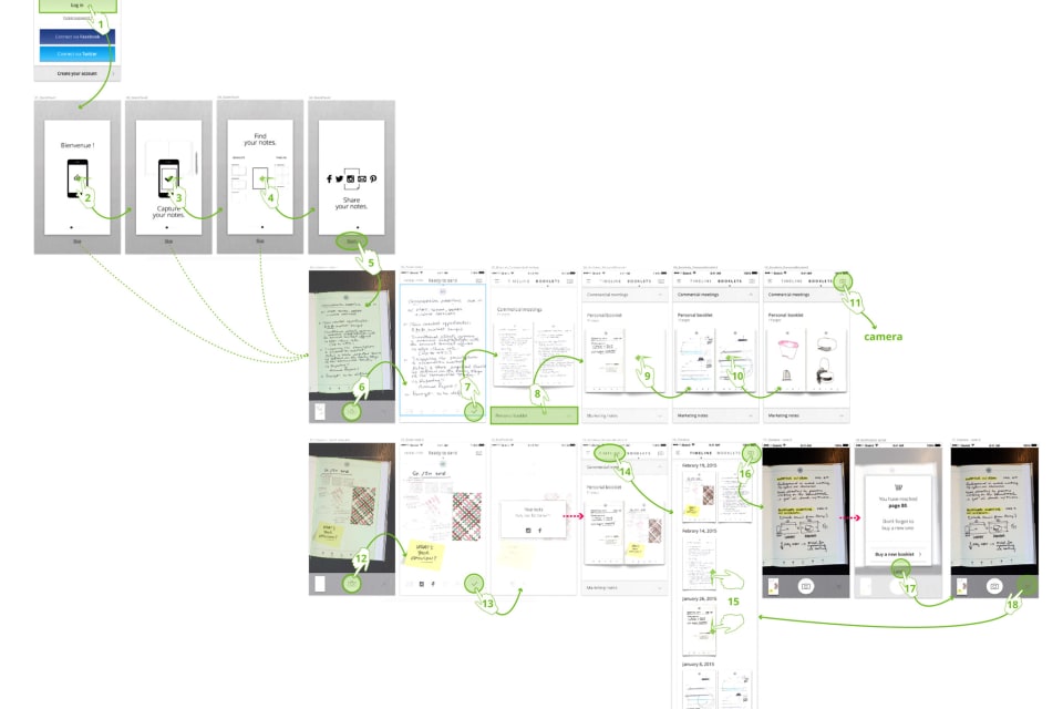 Nous avons d'abord mis en forme des imaginaires de services, puis esquissé les principaux écrans de l'application mobile avant de définir précisément tout le user flow, pour une expérience aussi fluide et raffinée que le carnet lui-même.